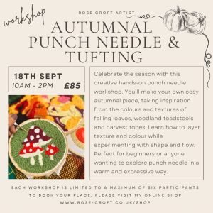 Celebrate the season with this creative hands-on punch needle workshop. You’ll make your own cosy autumnal piece, taking inspiration from the colours and textures of falling leaves, woodland toadstools and harvest tones. Learn how to layer texture and colour while experimenting with shape and flow. Perfect for beginners or anyone wanting to explore punch needle in a warm and expressive way.