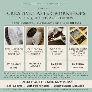 Join us for a full day of creativity inspired by the Fens. You’ll enjoy four artist-led taster workshops (each one hour long), designed to give you a feel for the techniques and ideas explored in our full-length sessions. It’s the perfect chance to experiment, play, and learn something new—all in a relaxed and inspiring setting.