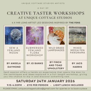 Join us for a full day of creativity inspired by the Fens! You’ll enjoy four artist-led taster workshops (each one hour long), designed to give you a feel for the techniques and ideas explored in our full-length sessions.