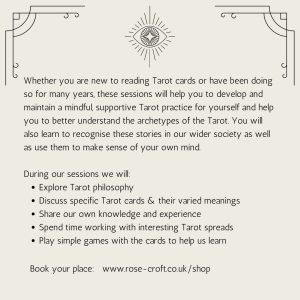 Whether you are new to reading Tarot cards or have been doing so for many years, these sessions will help you to develop and maintain a mindful, supportive Tarot practice for yourself and help you to better understand the archetypes of the Tarot.
