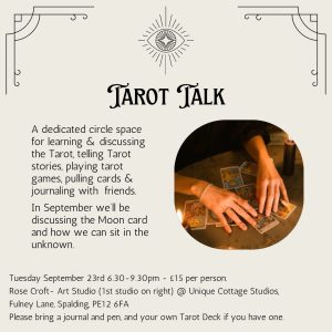 Please bring a journal and pen, and your own Tarot Deck if you have one.